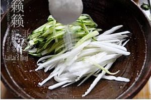 将大白菜丝及黄瓜丝放入大碗中,撒上少许精盐腌制出水后,拧干水分备用;
