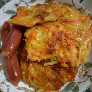 土豆胡萝卜去皮用擦板擦成粗丝(粗丝口感更好),放适量的盐,放置一会