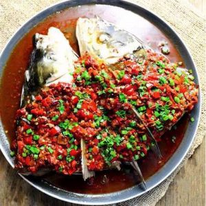 锅中入少量油将红剁椒、豆瓣酱、椒酱,红油豆豉炒香,将炒好的剁椒酱均匀的铺在鱼头上