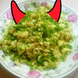 锅中再次倒油,油冒烟了就将鸡蛋滑入油中;这时边上的鸡蛋开始凝固,中间还有一些蛋液的时候倒入炒好的青椒迅速翻炒。用锅铲将结一起的大块弄开,加盐即可!