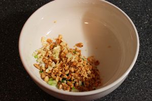 葱蒜切末,花生碾压后切碎