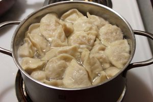 锅中烧水,水开后加入少量盐,饺子下锅,水再次烧开后加入一小碗冷水,重复三次,水第四次烧开后饺子可以出锅