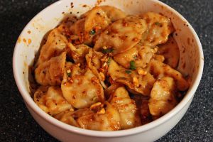 将饺子与之前调配好的调料和配料一起拌匀即可