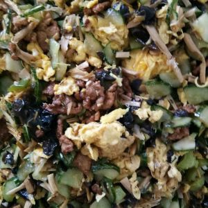 最后葱姜蒜炝锅,投入肉片,鸡蛋,焯过水的木耳,黄花,黄花煸炒,放入盐,生抽,老抽,白糖等搅拌均匀出锅。