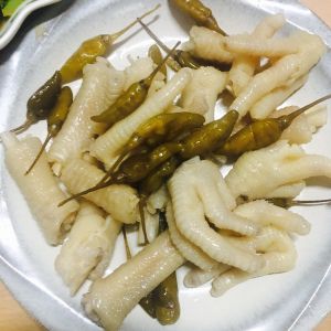 买好的泡椒,一袋全部倒入泡椒水也要倒入哦!如果不够不要紧,用白酒我买的是小牛二,如果做一斤凤爪可以放1/3白酒,我做的比较多,所以一整瓶小牛二,白酒➕醋少许,盐两—三勺依据个人口味吧!放冰箱泡一宿就可以吃了