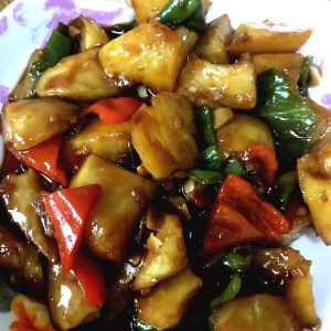 炸好的土豆茄子倒进去,翻炒均匀。