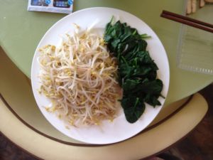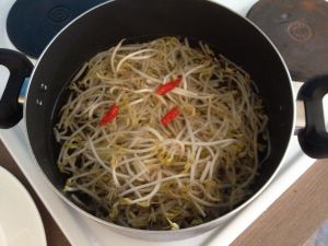 放干辣椒 盐 热水下锅煮豆芽菜 到水再次沸腾捞出豆芽菜