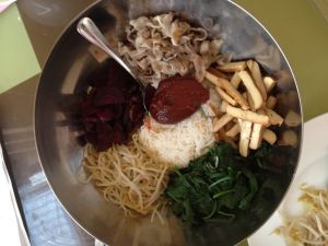 将所有食材放入大碗中 加入拌饭酱 自己随意拌即可