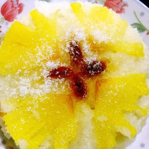 蒸好的菠萝饭,取一干净盘子,反扣过来,最后洒上一层薄薄的白沙糖即可。