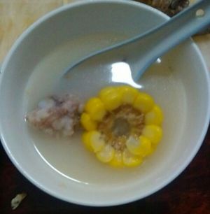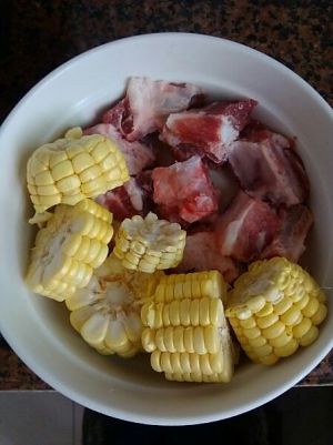 两小时后捞起猪大骨,再放入姜,玉米继续煲半小时,后再放入排骨还是小火。
