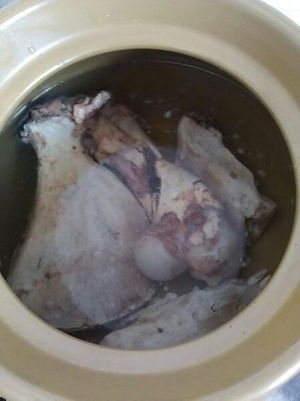 砂锅中加入水和猪大骨,冷水入锅小火煲两小时,锅盖上一定要盖上湿毛巾,锅内的水分才不会被蒸发