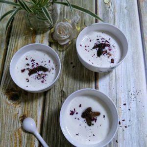 凉了放葡萄干,撒上玫瑰花瓣,可以做三碗,一家三口开吃