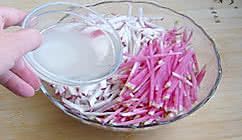 将两种萝卜丝搅拌均匀,加精盐调拌后加入醋,白糖拌匀即可