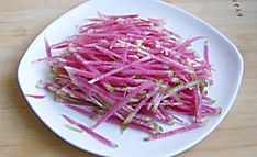 将心里美萝卜削去根须蒂缨洗净,剖成两瓣,直刀切成片,再切成细丝