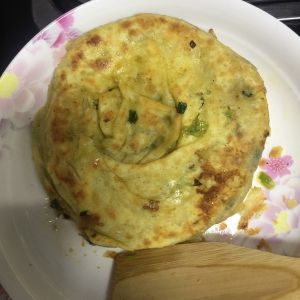 将面团分成若干剂子,擀成薄片,涂上香葱末和色拉油还有五香粉拌的调料,卷一起擀薄!