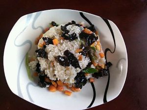 片刻加入白米饭炒匀,加胡萝卜丁,少许鸡粉,盐,略翻炒,出锅。