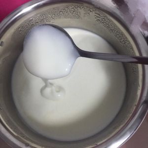 把酸奶机的不锈钢盆用开水冲洗消毒,(搅拌用的勺子也要一起消毒哦~)然后先倒一袋牛奶