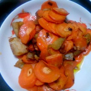 放入胡萝卜片翻炒至胡萝卜外表发亮且开始变软,加入肉丝大火炒30秒后关火趁热加盐拌匀即可。