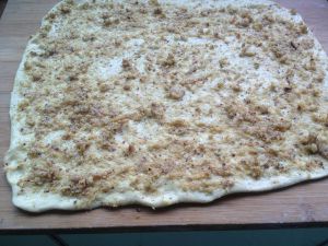 将面团擀成厚越5毫米的面皮,并将核桃沫、花生沫、橄榄油和盐混合在一起的馅料均匀涂抹在面皮上。