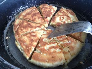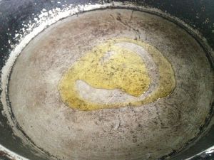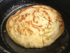自己注意饼的情况,待一面煎成金黄色的时候将饼翻面。