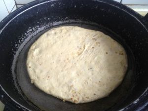 将擀好的薄饼放入平底锅中盖上锅盖小火煎。