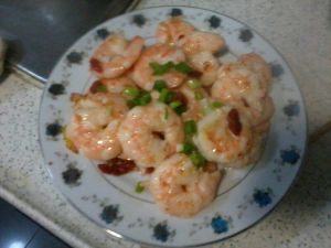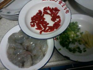 两个小时后,起油锅。加入姜丝后入虾仁快速翻炒。虾仁全部成红色即可。出锅后撒上葱花,枸杞。大功告成了。