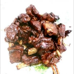 排骨呈金黄色,放入一勺料酒,两勺味极鲜,一勺酱油,三勺醋,三勺糖,翻炒几下。放进开水漫过排骨,盖上盖闷20分钟。