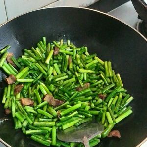 将腊肉直接放入不加油的锅中,开小火慢慢将腊肉的油煎出来,等到腊肉变透明了加入少许油,再将蒜苔倒入一起翻炒。三四分钟后加入少许盐,鸡精。起锅。