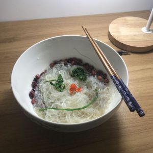 1花蛤汁放一碗 2锅里加油花生炒熟 3锅里花生放进花蛤汁 4空锅煮水烧开粉丝 最后放葱 5放入之前有花生和花蛤汁的碗 6摆盘 粉丝为脸 花生做头发 葱做眼睛嘴巴 辣椒做鼻子