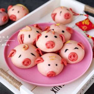 猪鼻子和耳朵粘在相应的位置上,可摸少许水好固定,猪鼻子用筷子扎俩眼更真实,眼睛用黑色面团按自己喜好粘好,其他颜色随意装饰在头顶或者身上,把所有小猪馒头生坯都做好,放在铺了油纸的蒸烤盘中。