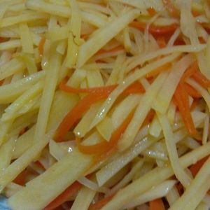 准备好土豆,胡萝卜七八分熟的时候放入土豆丝