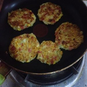 锅底少许油,不粘锅可以不放油,为了减肥可以少油。比较粘,手沾水再去弄土豆泥,团成圆球压扁,不可太扁,不然不好翻。