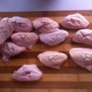 鸡翅洗净,沥干水分,用刀在鸡翅两面划上几刀。