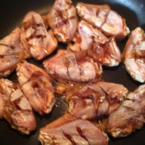平底锅烧热后,放入腌制好的鸡翅,鸡皮面朝下,煎制。