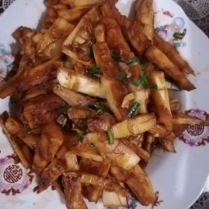 翻炒到表面略黄,加入一汤匙料酒,一汤匙生抽和半汤匙白糖及老抽继续翻炒
