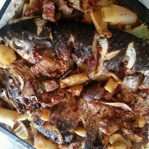 鱼从上背开边杀好洗净,用盐,料酒,椒盐,小茴腌制二十分钟后,按图的样子放入预热后的烤箱中层,用220度上下层烤25分钟。