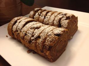 出炉后把蛋糕倒扣,小心地撕下油纸再盖上以防水分蒸发,稍凉后再翻面,等表面降温,涂上打发好的淡奶油(我没涂)。用油纸卷起,放入冰箱冷藏20分钟。取出后切片,在表面撒一层糖霜。完成啦!