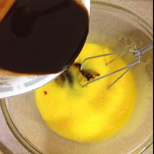 蛋白滴几滴白醋,放入无油无水的盆中用电动打蛋器打发至湿性发泡(提起打蛋器蛋白呈下垂的尖峰),其间分3次加入蛋白部分的白砂糖。