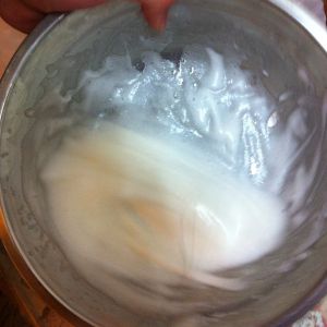快速的打。看啊我的打蛋器都隐身了!达到完全发泡。像奶油一样。