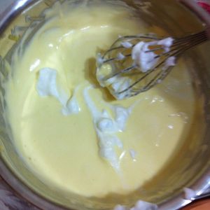 然后把打发的蛋白分两次加入面糊里,记住要上下拌匀不要打圈!!!不要打圈!!!我的盆边因为有的蛋白搅不到我就划了几个圈,于是盆边的都消泡了,变得很稀。