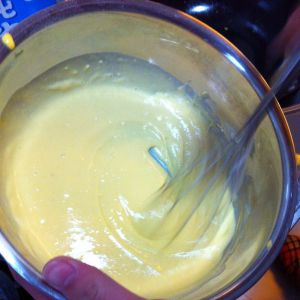 中间步骤忘记了拍啊!!!就是把打好的蛋黄倒入几勺面粉里面,可以尽量少放点面粉。然后倒入牛奶。牛奶要比面粉的一半再多一点,大概就是能搅成图上的感觉就差不多了。