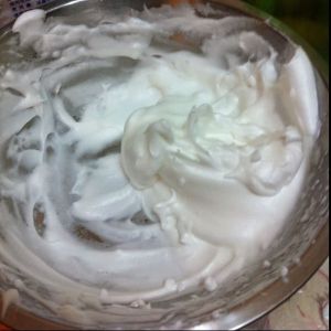 蛋清蛋白分离,把里面的那个类似脐带的白色物质跳出来,那玩意儿影响口感。。用打蛋器打发蛋白成泡沫丰富的如图,加1/3糖,继续打,然后没有颗粒感以后再加第二次,第三次。