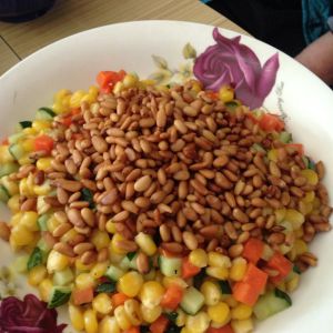 油热下入胡萝卜翻炒几下,下入玉米粒,大火翻炒2分钟放入盐、糖、鸡精。最后放入黄瓜翻炒几下勾芡出锅
