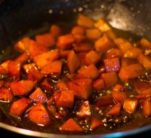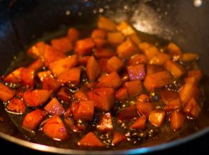 扔切好的土豆,快速炒至变色半熟,加酱油。注意随时加水,别糊了!