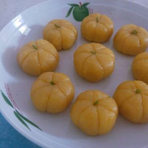 南瓜切小块隔水蒸熟,压成泥,加入糯米粉和糖揉成光滑的团。然后把大团揪成一个个乒乓大的小团,稍微压扁。用勺子压出南瓜的纹,摘空心菜的梗,小一点,压在顶部。南瓜饼底部涂少许油放在空心菜叶子上。热水上蒸锅,蒸八分钟即可。
