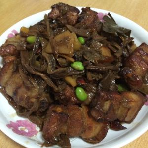 待水不多的时候倒入切好的干豆角,毛豆,继续煮二十分钟,期间翻炒几次,以免粘锅。放盐。