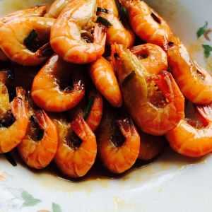 开锅盖,倒入蒸鱼豉油适量,生抽一丁点,白糖适量,炒到酱汁发稠,均匀包裹在每只虾身上后就可以关火了。