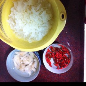 将准备好的雪耳,花胶飞水。红枣,杞子泡水待用。