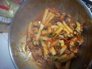 入锅翻炒,先将油熬熟,爆炒大葱香葱红辣椒,然后放入螃蟹,再放年糕,最后放辣酱。