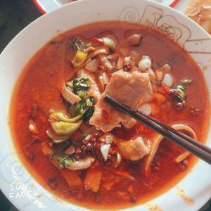 各种蔬菜洗净备用,锅里倒油,加入姜片爆香后加入豆瓣酱小火炒出红油,加入适量水,大火煮开,放入蔬菜肉片,肉片变白,用筷子能插透就熟了,连汤一起倒入汤碗里,把切好的大蒜末花椒辣椒粒撒在肉片上